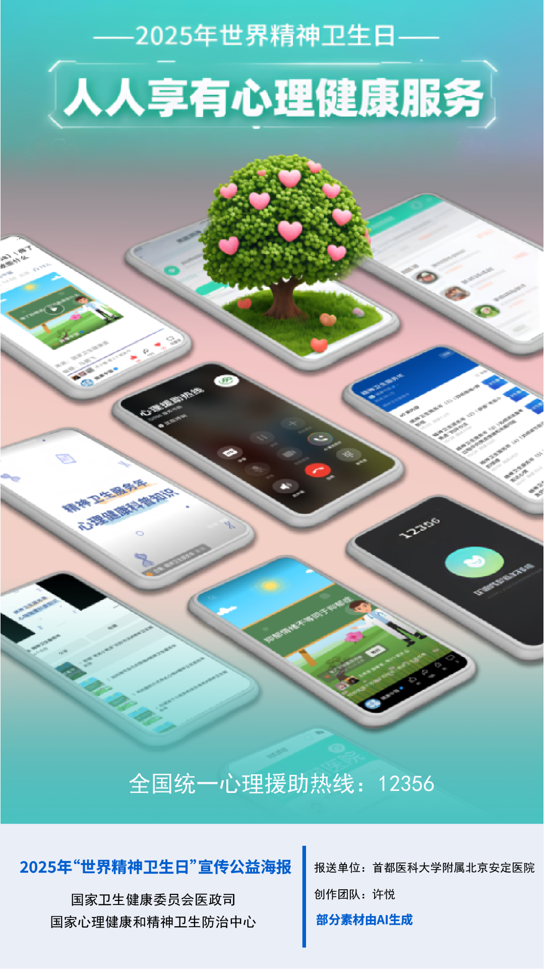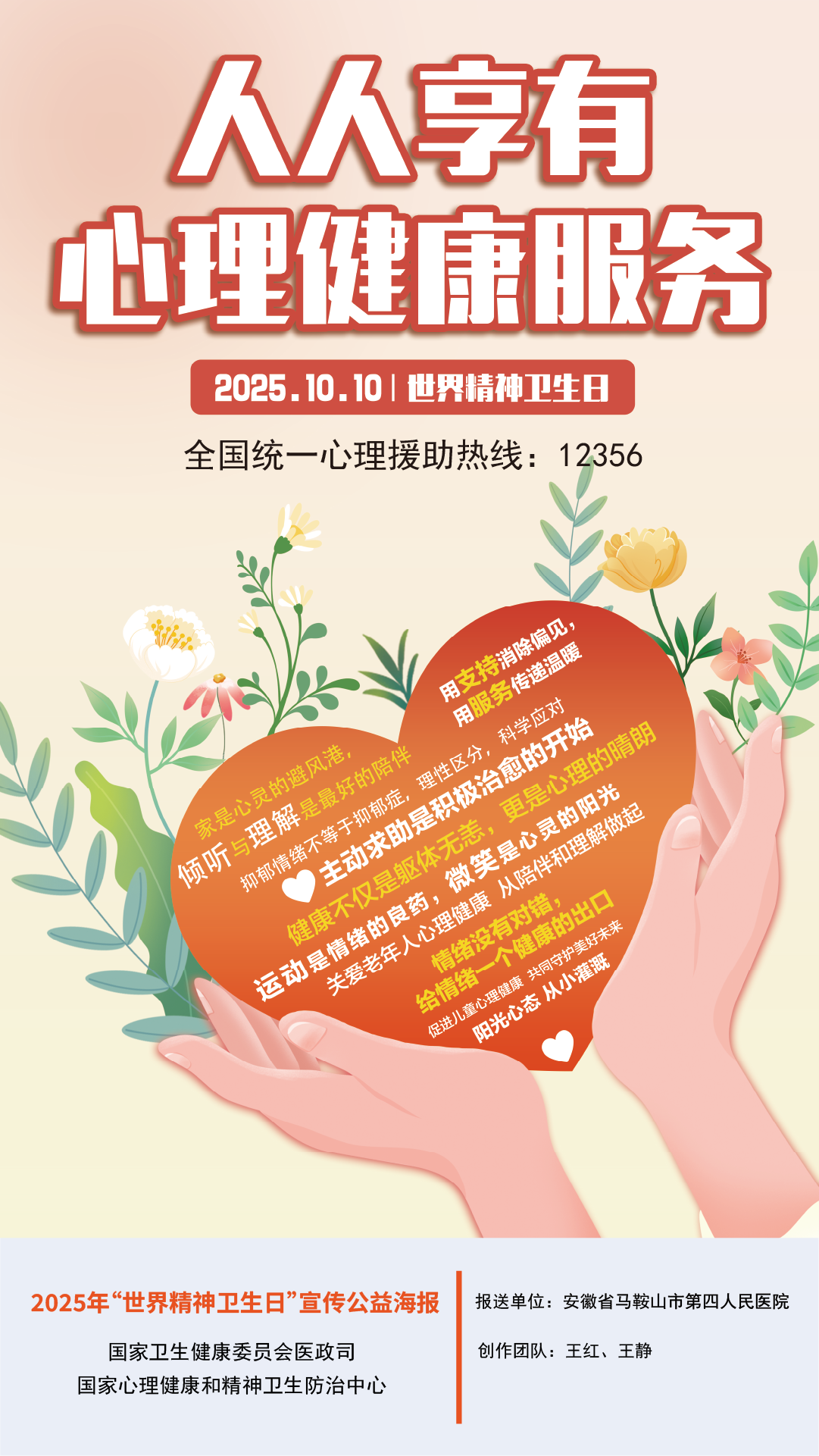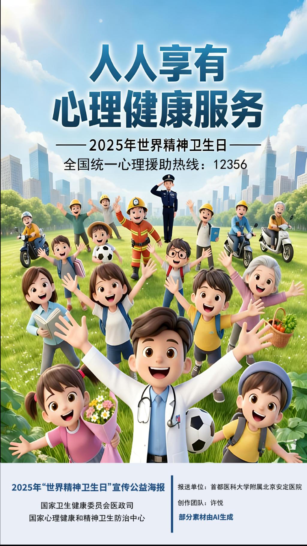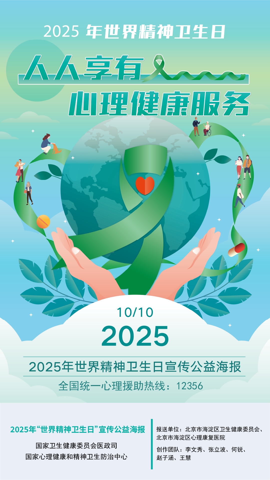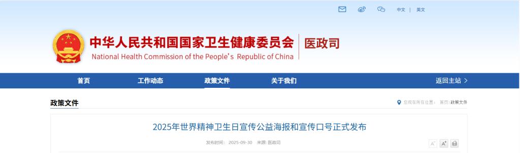 2025年10月10日是第34个世界精神卫生日,今年活动主题为“人人享有心理健康服务”。为进一步调动社会各界积极性,前期面向各地征集了宣传海报,并组织起草了宣传口号。经国家心理健康和精神卫生防治中心组织专家遴选,确定了6张公益海报、10条宣传口号在国家卫生健康委官网发布,供各地使用。