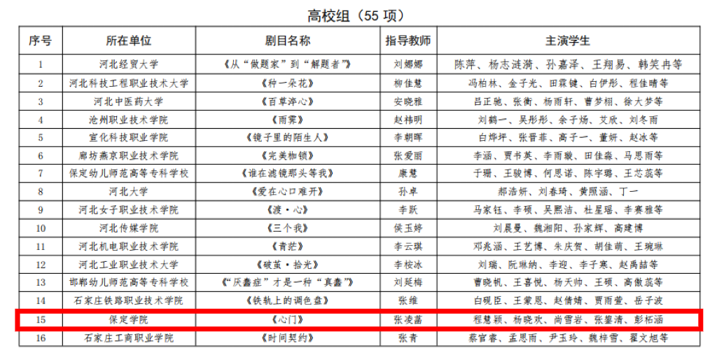 近日,河北省教育厅公布第二届全省学生心理健康教育优秀成果评选结果,我校音乐舞蹈学院教师张凌菡指导的剧目《心门》获评优秀校园心理情景剧(高校组)。该剧聚焦大学生心灵成长,以细腻的艺术表达传递正能量,获得专家一致认可。